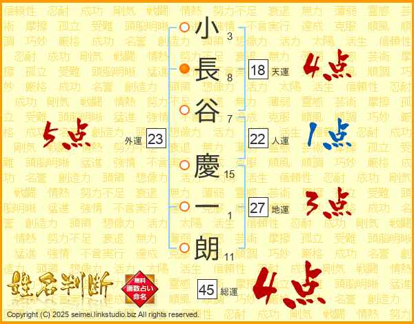 小(3画)長(8画)谷(7画) 慶(15画)一(1画)朗(11画)
