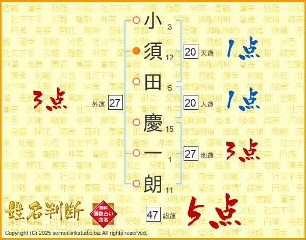 小(3画)須(12画)田(5画) 慶(15画)一(1画)朗(11画)