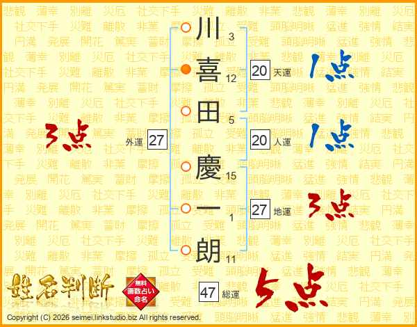 川(3画)喜(12画)田(5画) 慶(15画)一(1画)朗(11画)