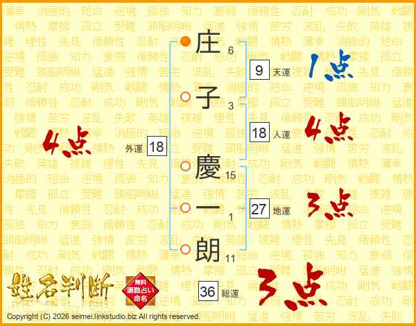 庄(6画)子(3画) 慶(15画)一(1画)朗(11画)