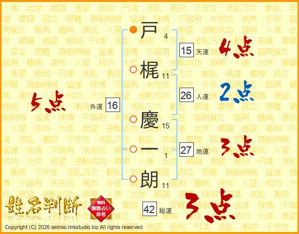 戸(4画)梶(11画) 慶(15画)一(1画)朗(11画)
