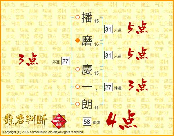 播(15画)磨(16画) 慶(15画)一(1画)朗(11画)