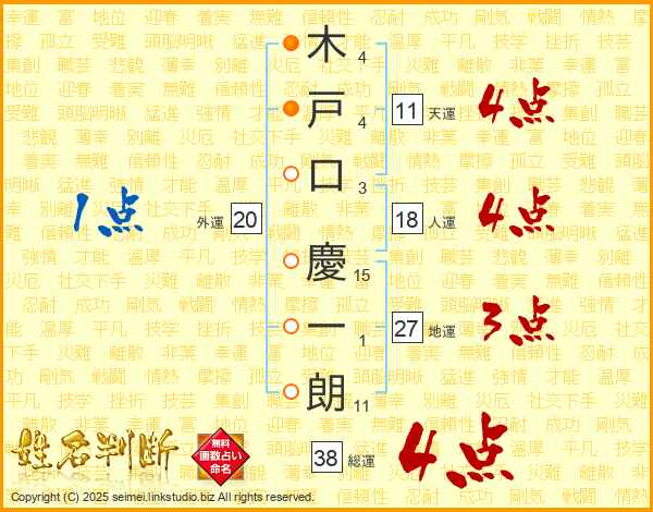 木(4画)戸(4画)口(3画) 慶(15画)一(1画)朗(11画)