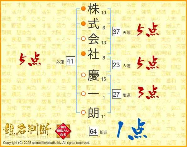 株(10画)式(6画)会(13画)社(8画) 慶(15画)一(1画)朗(11画)