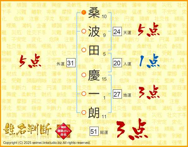 桑(10画)波(9画)田(5画) 慶(15画)一(1画)朗(11画)