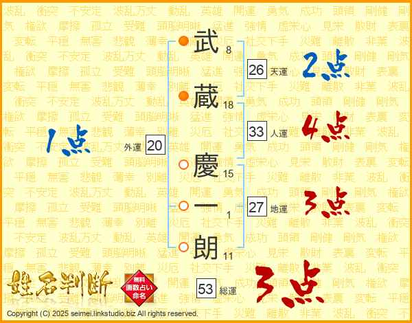 武(8画)蔵(18画) 慶(15画)一(1画)朗(11画)