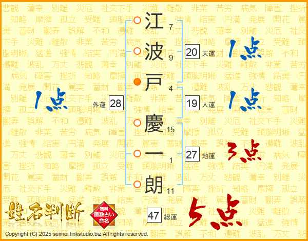 江(7画)波(9画)戸(4画) 慶(15画)一(1画)朗(11画)