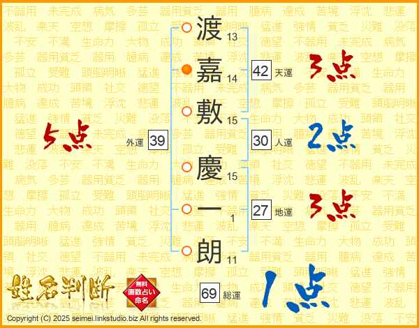 渡(13画)嘉(14画)敷(15画) 慶(15画)一(1画)朗(11画)