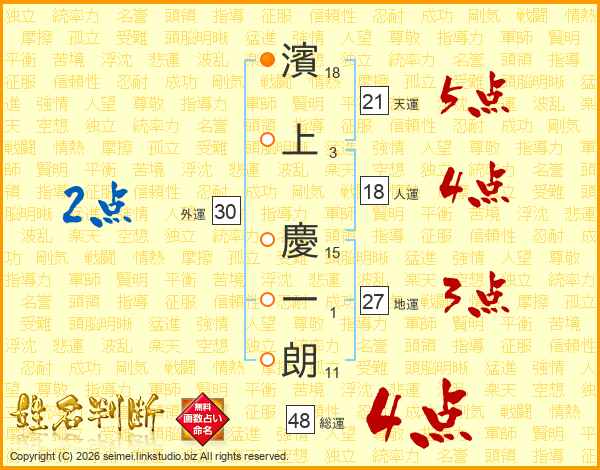 濱(18画)上(3画) 慶(15画)一(1画)朗(11画)