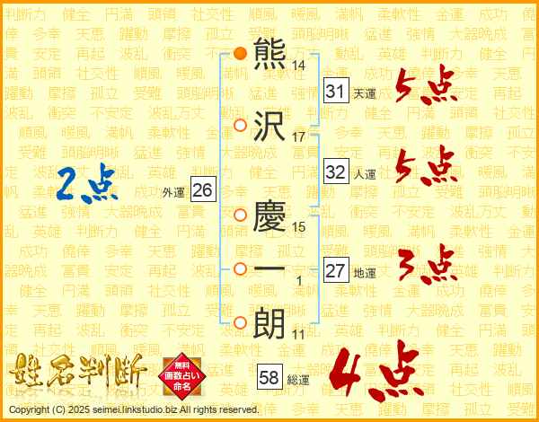 熊(14画)沢(17画) 慶(15画)一(1画)朗(11画)