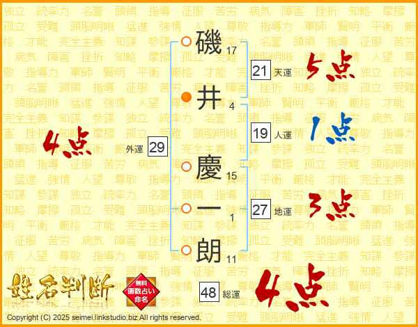 磯(17画)井(4画) 慶(15画)一(1画)朗(11画)