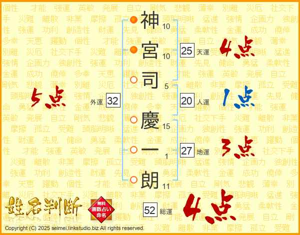 神(10画)宮(10画)司(5画) 慶(15画)一(1画)朗(11画)
