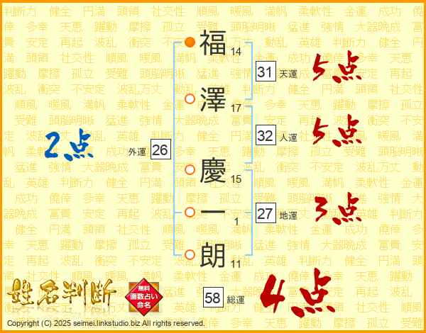 福(14画)澤(17画) 慶(15画)一(1画)朗(11画)