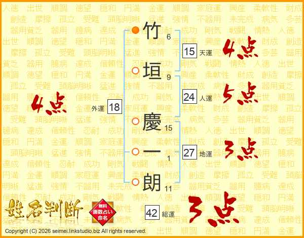 竹(6画)垣(9画) 慶(15画)一(1画)朗(11画)