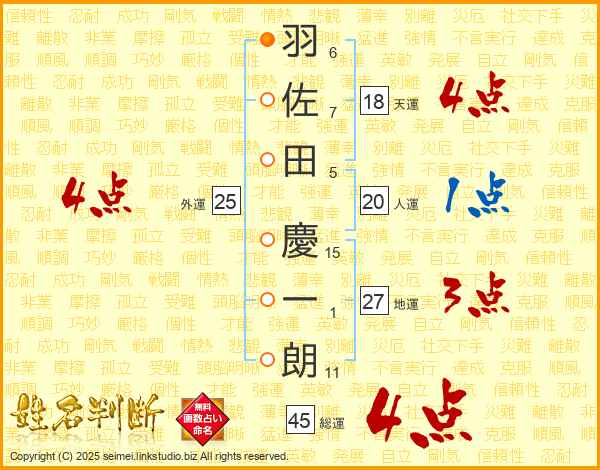 羽(6画)佐(7画)田(5画) 慶(15画)一(1画)朗(11画)