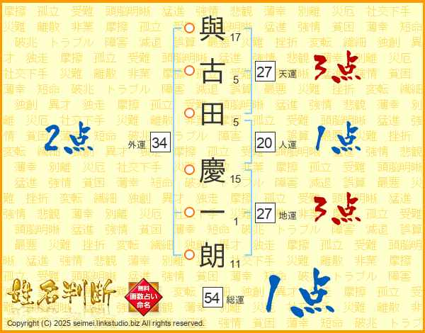 與(17画)古(5画)田(5画) 慶(15画)一(1画)朗(11画)