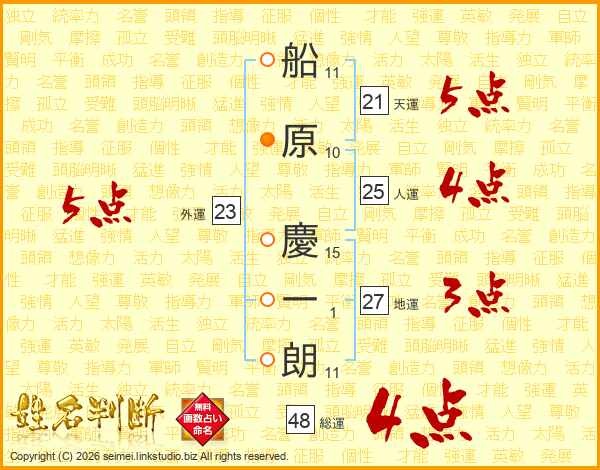 船(11画)原(10画) 慶(15画)一(1画)朗(11画)