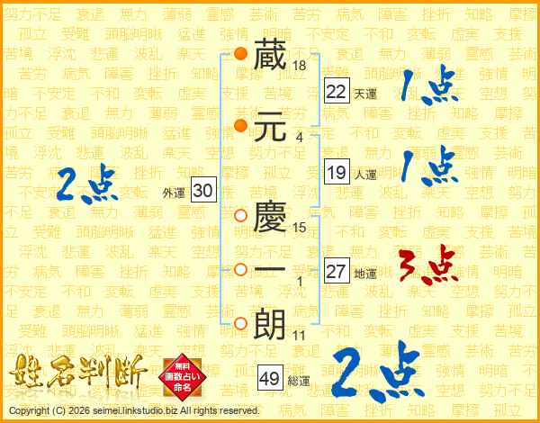 蔵(18画)元(4画) 慶(15画)一(1画)朗(11画)