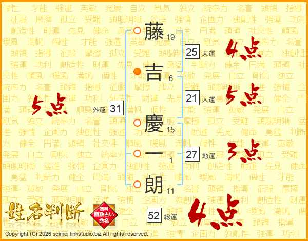 藤(19画)吉(6画) 慶(15画)一(1画)朗(11画)
