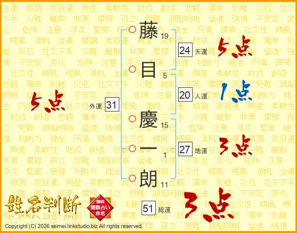 藤(19画)目(5画) 慶(15画)一(1画)朗(11画)