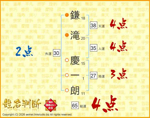 鎌(18画)滝(20画) 慶(15画)一(1画)朗(11画)