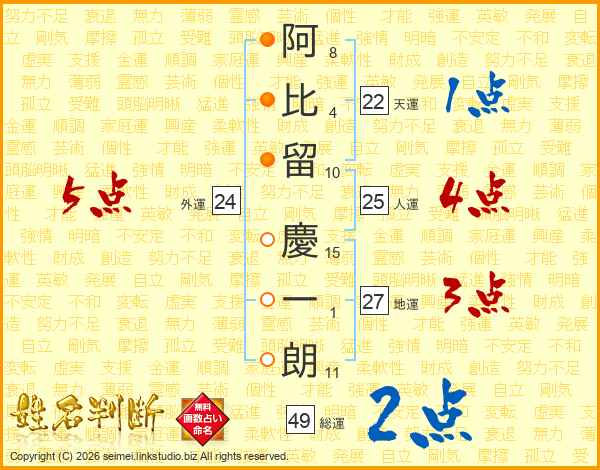 阿(8画)比(4画)留(10画) 慶(15画)一(1画)朗(11画)