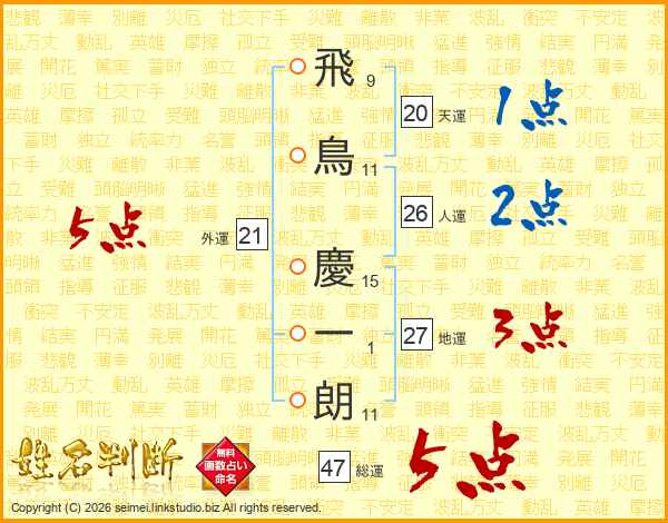 飛(9画)鳥(11画) 慶(15画)一(1画)朗(11画)