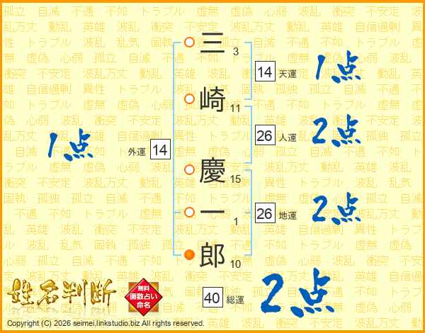 三(3画)崎(11画) 慶(15画)一(1画)郎(10画)