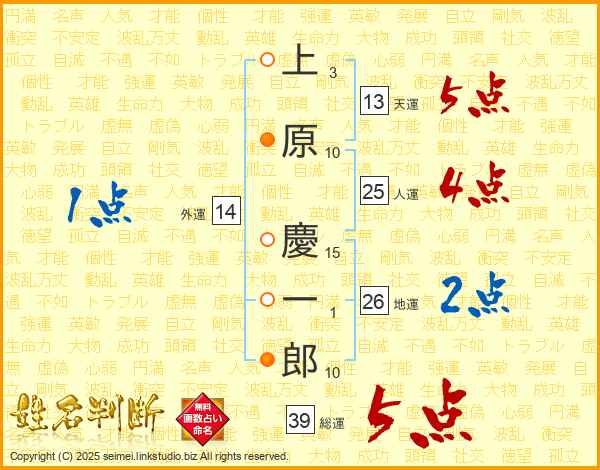 上(3画)原(10画) 慶(15画)一(1画)郎(10画)
