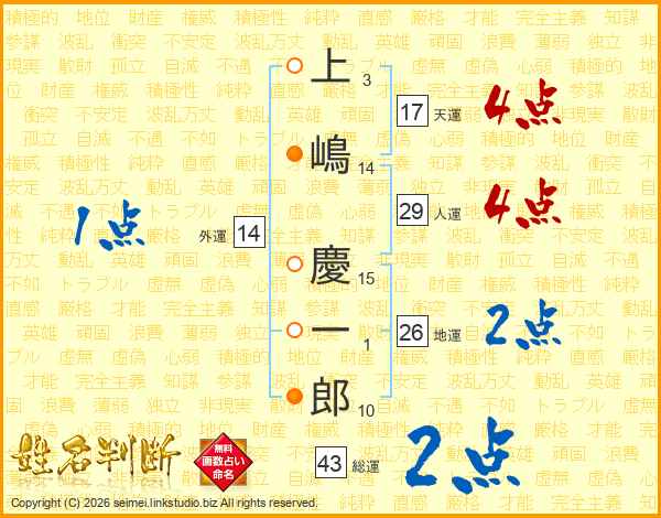 上嶋慶一郎さんの総運は43画の2点!