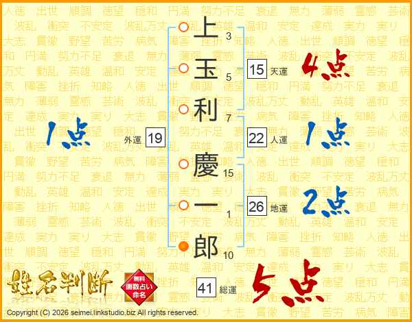 上(3画)玉(5画)利(7画) 慶(15画)一(1画)郎(10画)