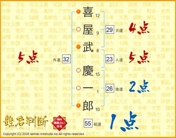 喜(12画)屋(9画)武(8画) 慶(15画)一(1画)郎(10画)
