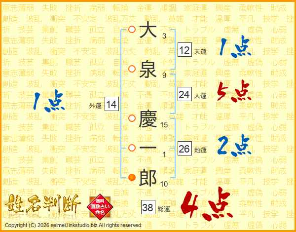 大(3画)泉(9画) 慶(15画)一(1画)郎(10画)