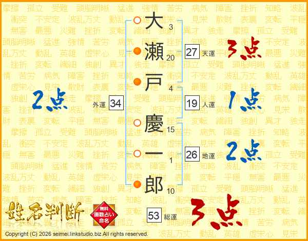 大(3画)瀬(20画)戸(4画) 慶(15画)一(1画)郎(10画)