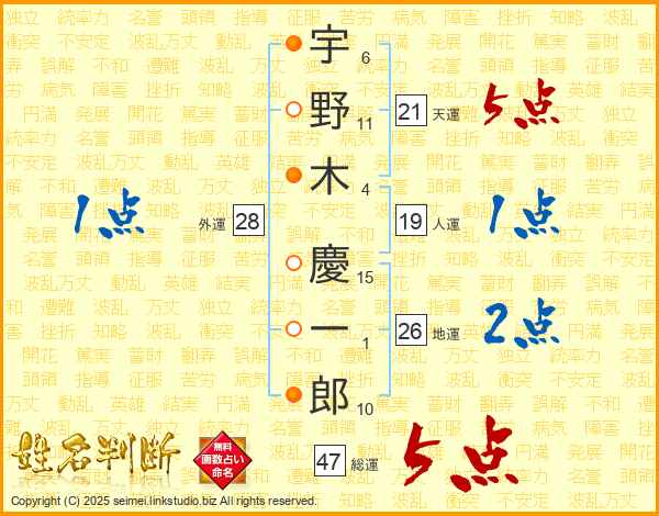 宇(6画)野(11画)木(4画) 慶(15画)一(1画)郎(10画)