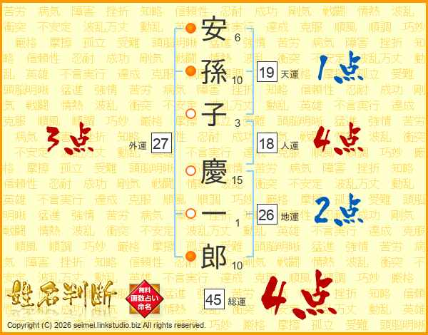 安(6画)孫(10画)子(3画) 慶(15画)一(1画)郎(10画)