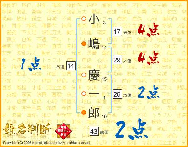 小(3画)嶋(14画) 慶(15画)一(1画)郎(10画)