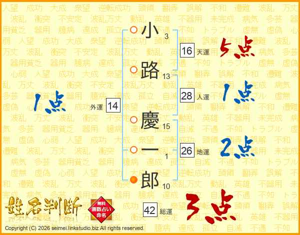 小(3画)路(13画) 慶(15画)一(1画)郎(10画)