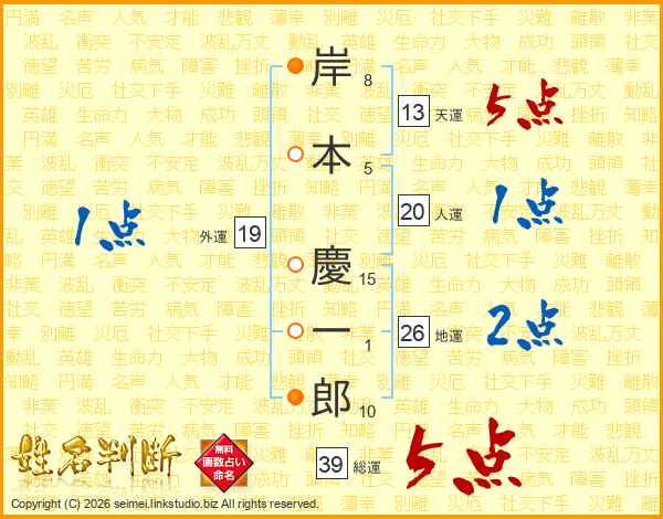 岸(8画)本(5画) 慶(15画)一(1画)郎(10画)