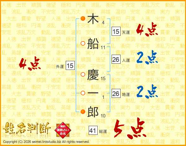 木(4画)船(11画) 慶(15画)一(1画)郎(10画)
