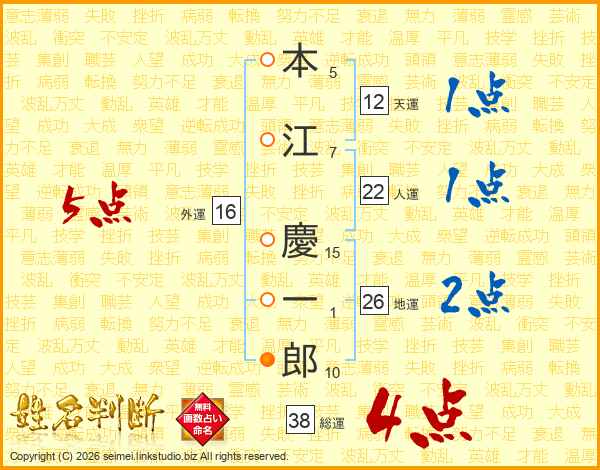 本(5画)江(7画) 慶(15画)一(1画)郎(10画)