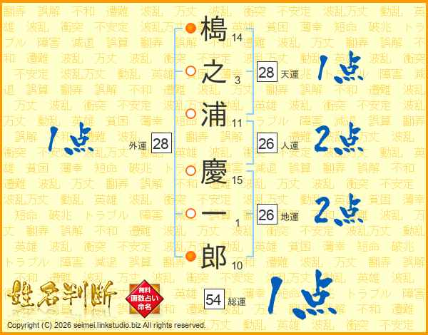 槝(14画)之(3画)浦(11画) 慶(15画)一(1画)郎(10画)