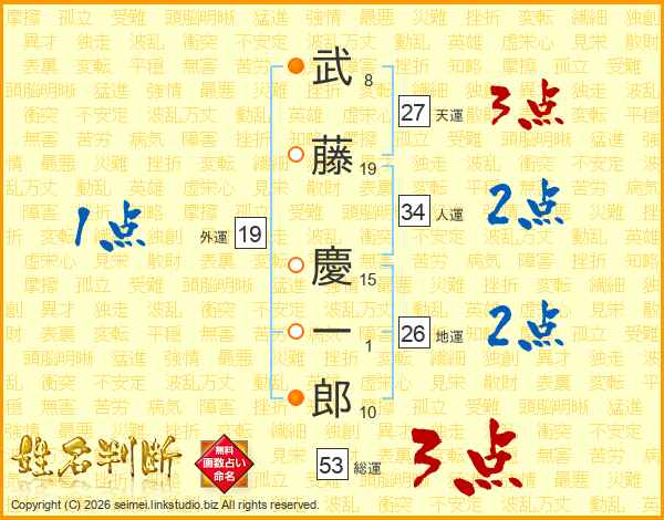 武(8画)藤(19画) 慶(15画)一(1画)郎(10画)