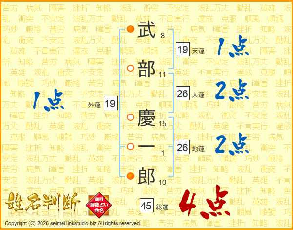 武(8画)部(11画) 慶(15画)一(1画)郎(10画)