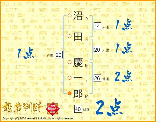 沼田慶一郎さんの人運は20画の1点!