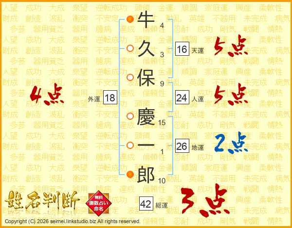 牛(4画)久(3画)保(9画) 慶(15画)一(1画)郎(10画)