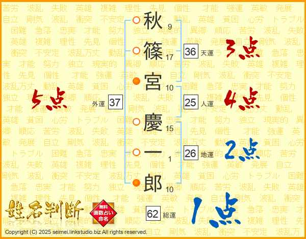 秋(9画)篠(17画)宮(10画) 慶(15画)一(1画)郎(10画)