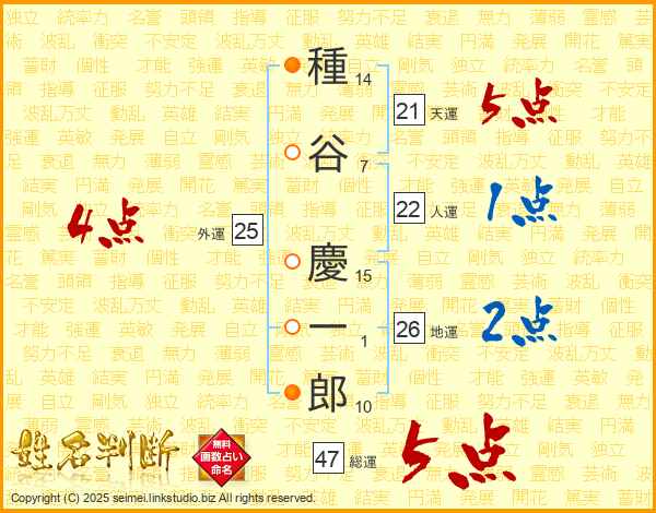 種(14画)谷(7画) 慶(15画)一(1画)郎(10画)