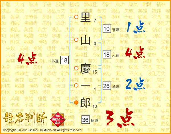 里(7画)山(3画) 慶(15画)一(1画)郎(10画)