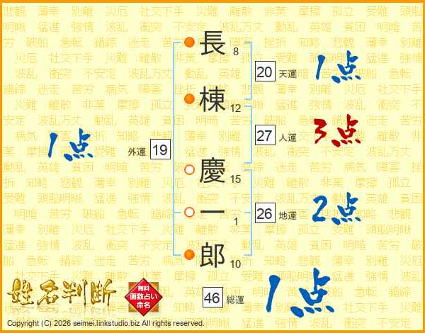 長(8画)棟(12画) 慶(15画)一(1画)郎(10画)